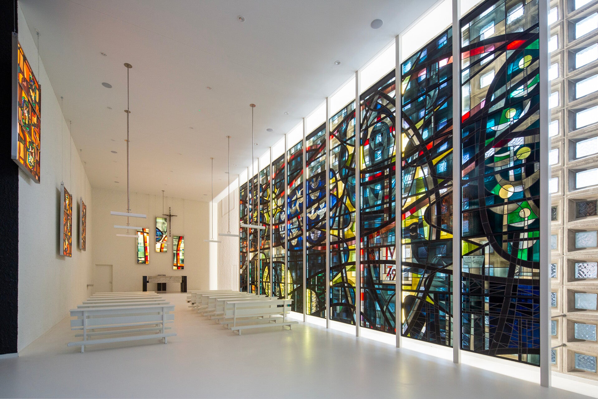 Voor het project van de vredeskapel ben ik ingehuurd door StudioVitri. De ramen die hier zijn geplaatst komen oorspronkelijk uit de Blijde Boodschap kerk te Rolducerveld. Deze kerk is al langer geleden afgebroken. De ramen hebben een tijd in de opslag gestaan en toen is er een nieuwe bestemming gezocht. De vredeskapel in Kerkrade werd grondig gerenoveerd en hier zijn de ramen uiteindelijk herplaatst. Een deel van de ramen is op lichtbakken geplaatst en aan het plafond opgehangen, een ander deel (de grote glaswand) is in een frame geplaatst voor een muur van glasblokken. Ook hier is aan de zijkant een ledstrip geplaatst om de panelen meer tot hun recht te laten komen. Dit is een mooie manier van hoe (kerkelijke) glas in lood kunst herbestemd kan worden.